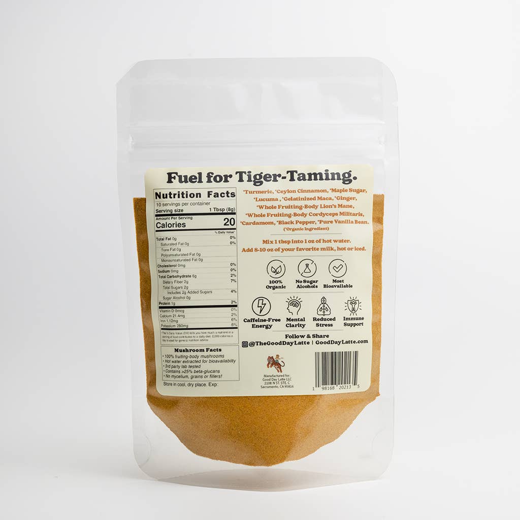 Turmeric, Ceylon Cinnamon, Maple Sugar, Lucuma, Gelatinized Maca, Ginger, Whole Fruiting-Body Cordyceps Mushroom, Whole Fruiting-Body Lion's Mane Mushroom, Cardamom, Black Pepper, Pure Vanilla Bean.